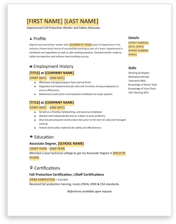 Fall Protection Resume Template Fall Protection Resume TemplateGet a head start and stand out with this fall protection resume template. Fill in the template with your information. Download ResumeSpanish Template Jim Cook2025-01-24T09:17:26-07:00